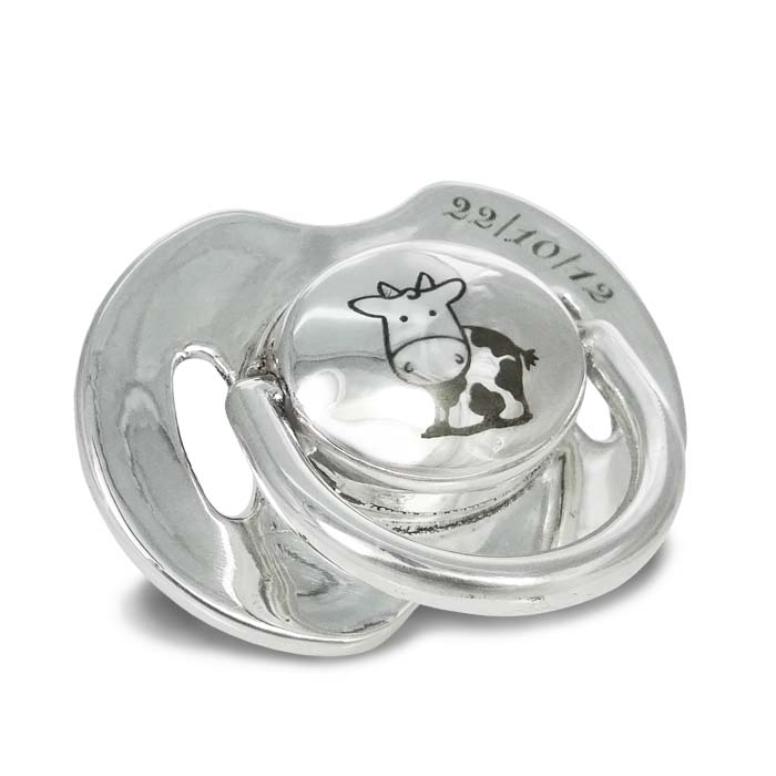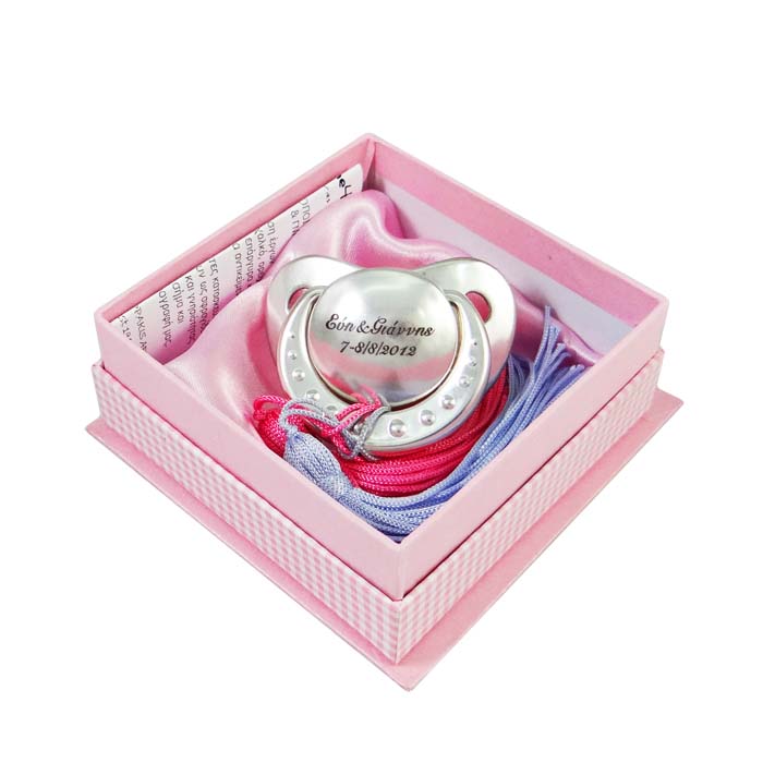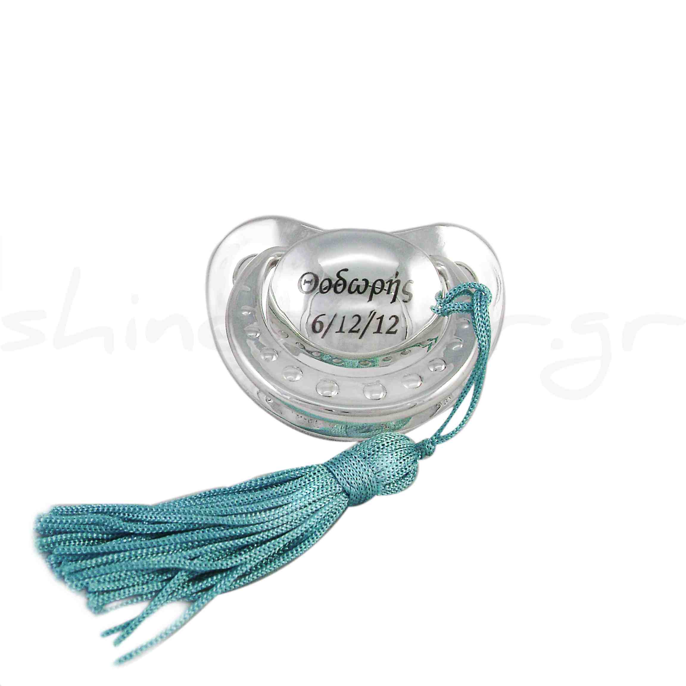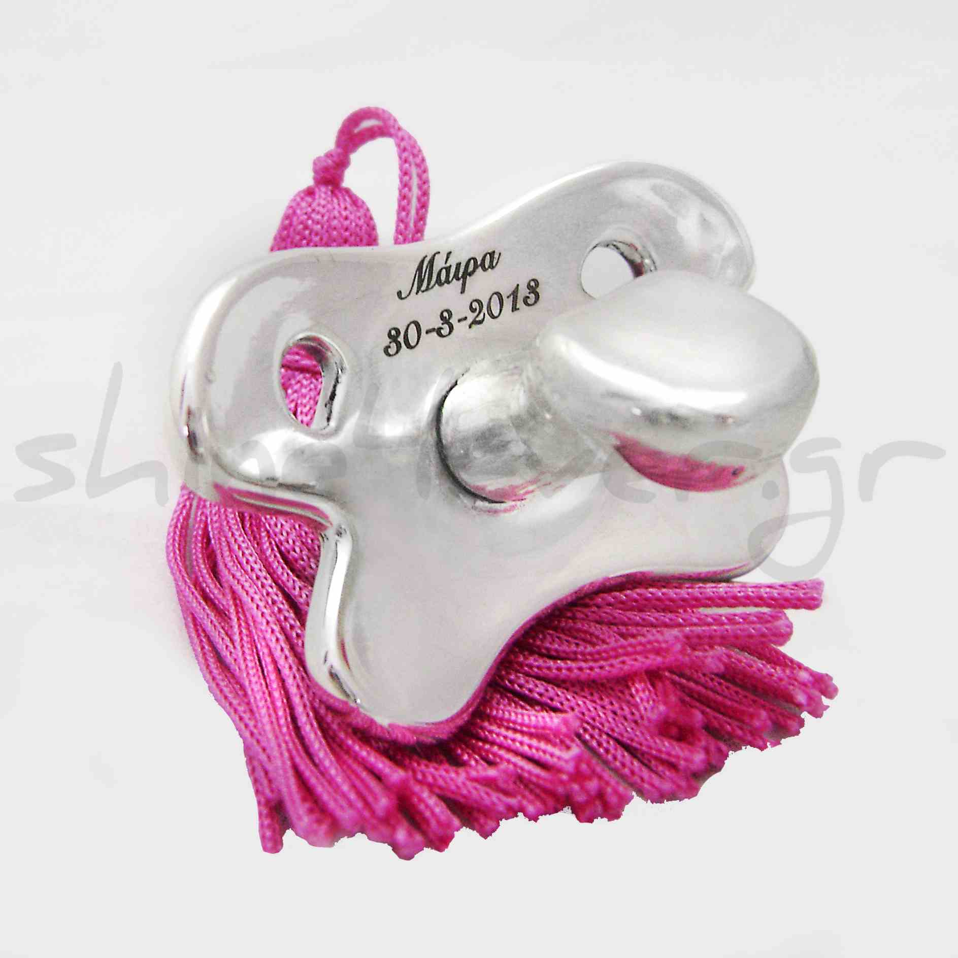 Silver baby’s pacifier with laser engraving, for a personalized gift, only by Shine4ever.gr.