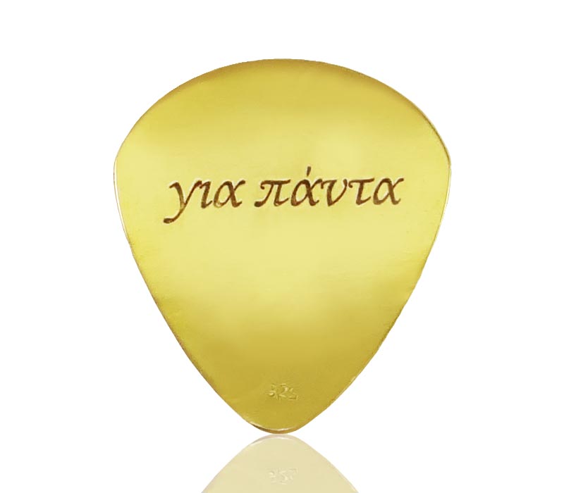 It can also be a pendant or a key-ring. It can also be gold-plated in 24K solution. The dimensions of the solid silver 925° guitar pick are 2.5cm x 3 cm x 1mm (thick).