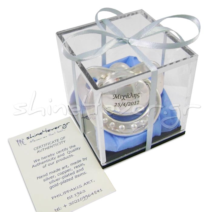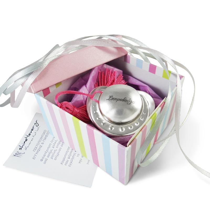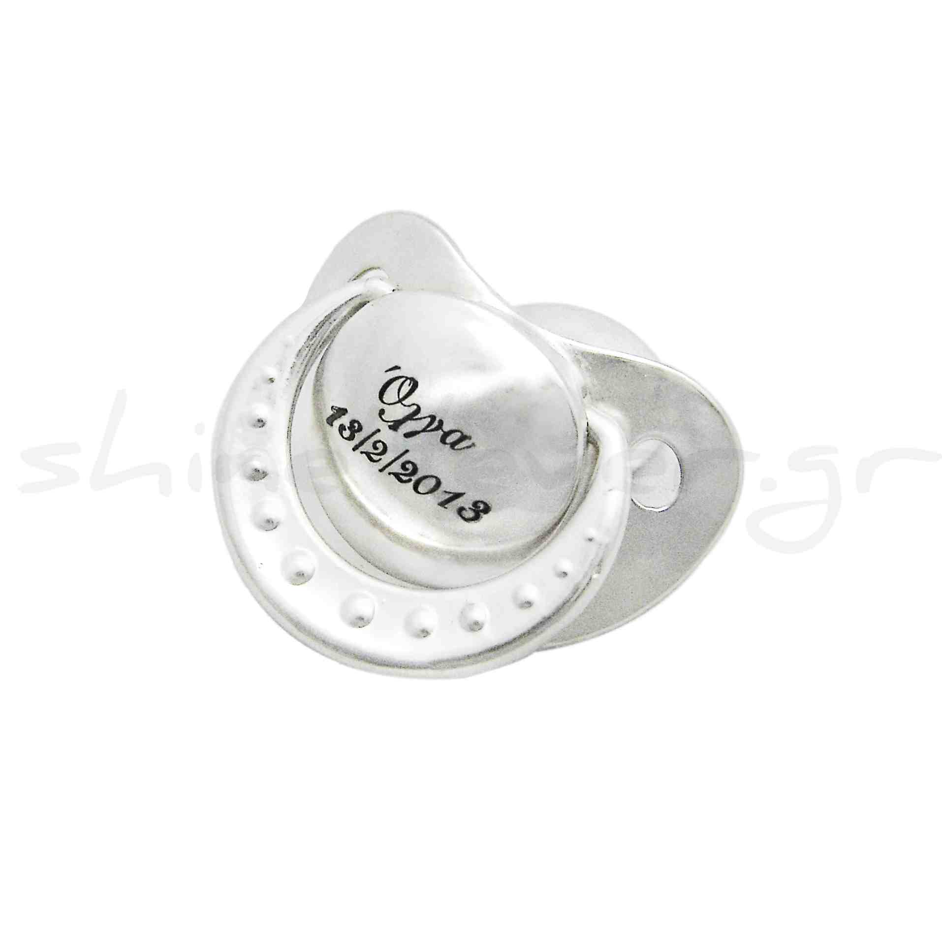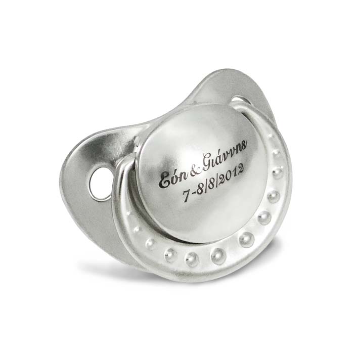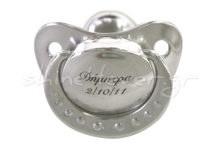Ασημένια πιπίλα με κρίκο και χάραξη ονόματος με laser, για ένα πιο προσωποποιημένο δώρο, μόνο από την Shine4ever.gr. “Ντύνουμε” με μέταλλο της αρεσκείας σας, την πιπίλα του μωρού σας ή και μια καινούργια ακόμα, για να κρατήσετε ένα ενθύμιο ή να κάνετε ένα πρωτότυπο δώρο! Και αν δεν έχετε τη δική του… σας την προμηθεύουμε εμείς! Δημιουργείστε το δικό του μοναδικό Shine4ever memorabilia!